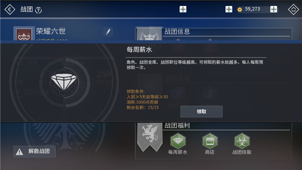 可在战团福利界面中查看,每周可消耗个人贡献领取薪水。角色等级、战团金库等级、战团职位等级越高,可领取的薪水就越多,每人每周限领取一次,且需达到指定要求